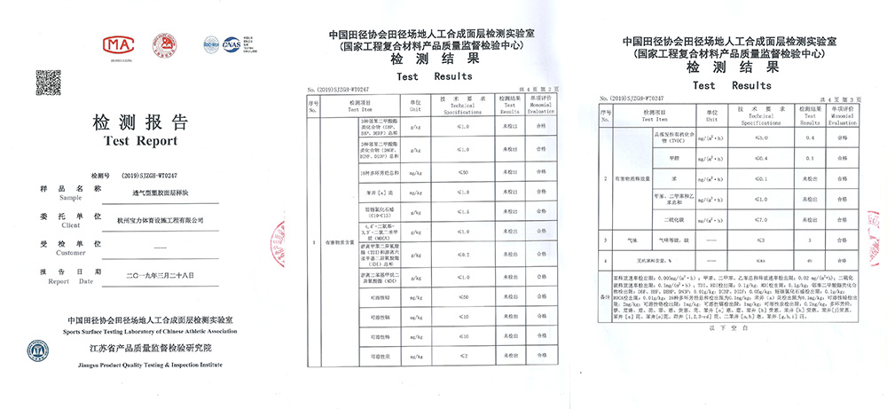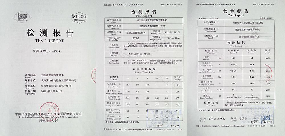 三大體系認證(iso9001質量管理體系、ISO14001環境管理體系、ohsas18001職業健康安全管理體系)通過中國田徑協會指定檢測機構化學性能物理性能檢測