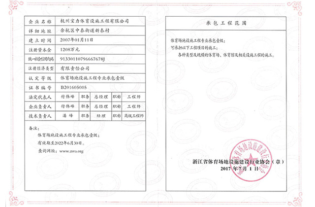 18年行業施工經驗、08年奧運會鐵人三項預制型跑道的鋪設,體育設施行業一級能力認證、12項施工設備專利、中 國田徑協會會員、同時具備體育設施市政房建資質、全國體育場地工程綠色施工單位。